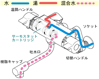 この図のように、サーモスタット混合水栓は